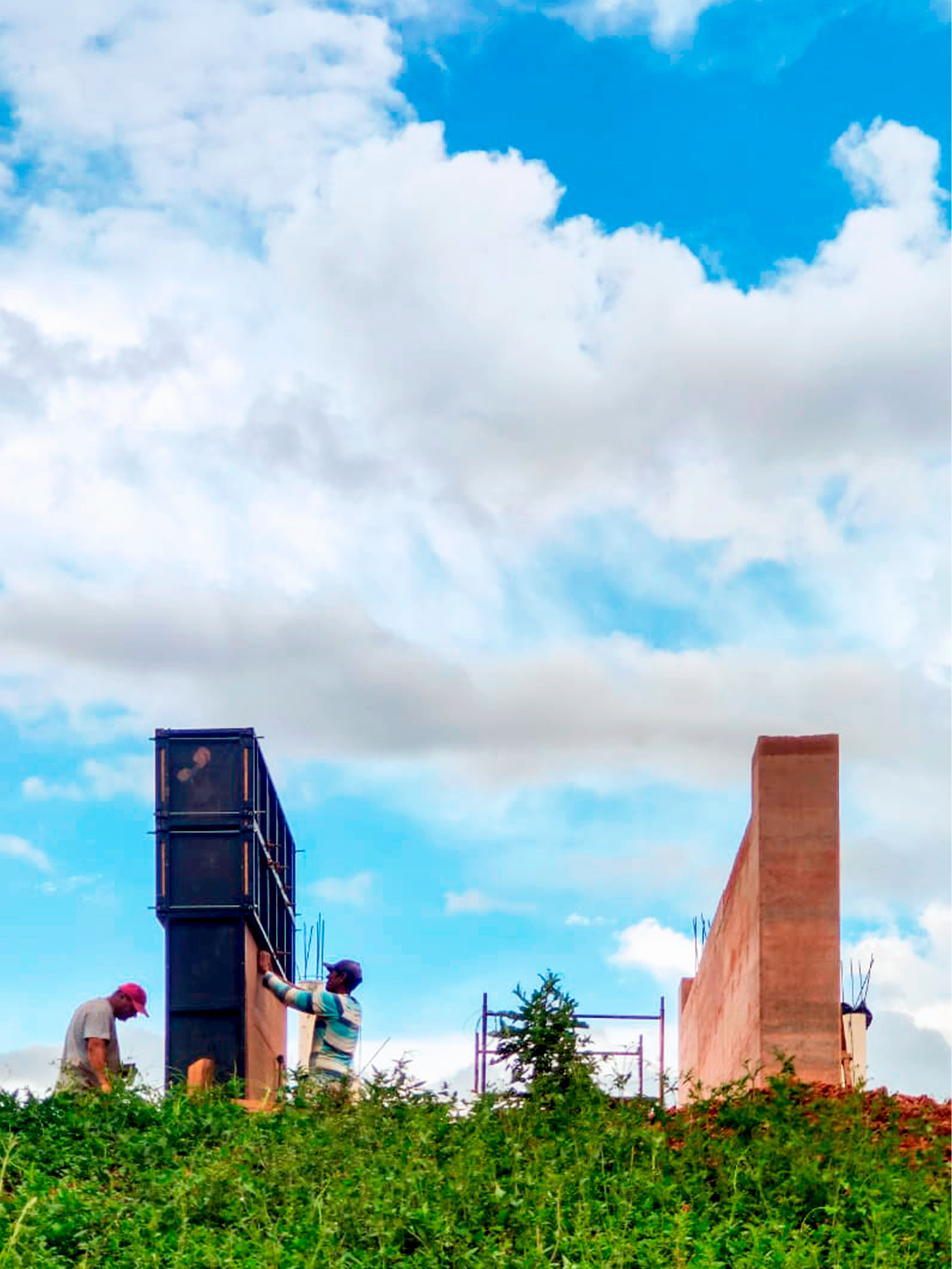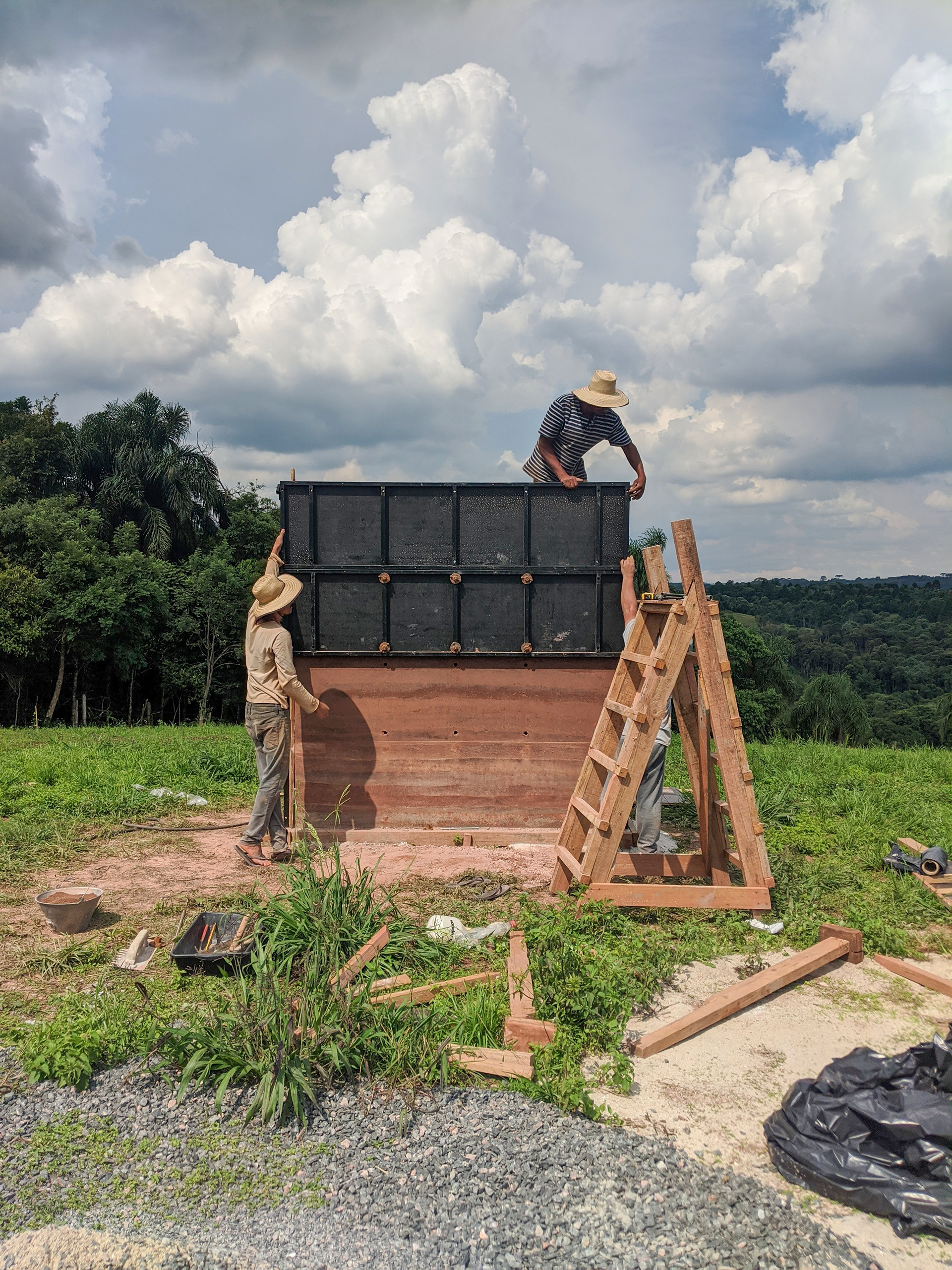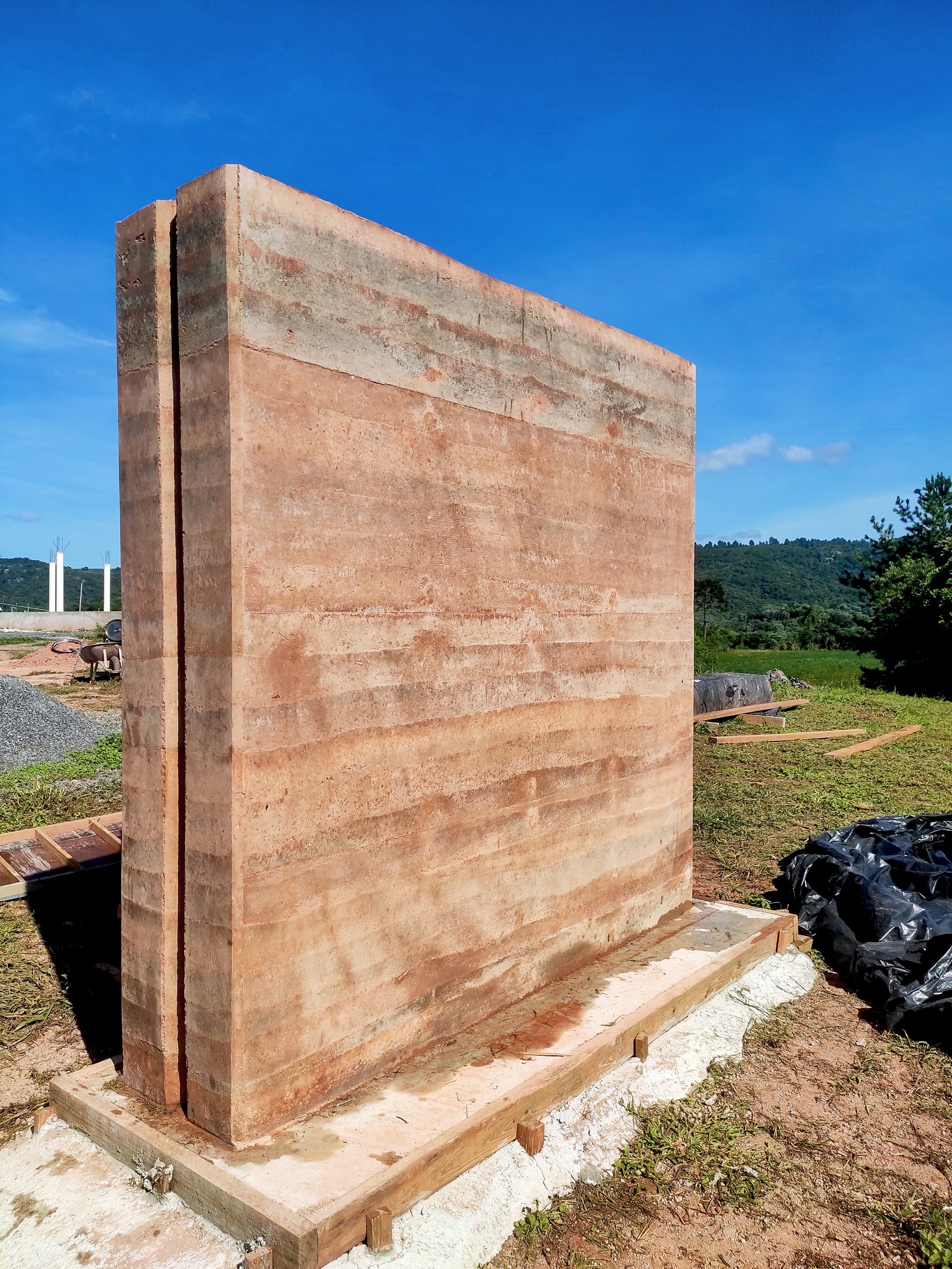 No ponto mais alto de uma propriedade em Balsa Nova decidiu-se fazer uma casa com a terra do lugar, utilizando a taipa de pilão como técnica construtiva. Então desenhamos a construção a partir do desenho do processo construtivo, começando pelas formas. Então fizemos corpos de prova, rompemos e definimos o traço da terra a ser utilizada. E passamos a dispô-la em camadas para o apiloamento. No topo há um detalhe de um berço no qual a laje de concreto maciça apoia-se. Há um espaço de confluência centralizado, de onde emergem cavernas de terra ou os quartos.
