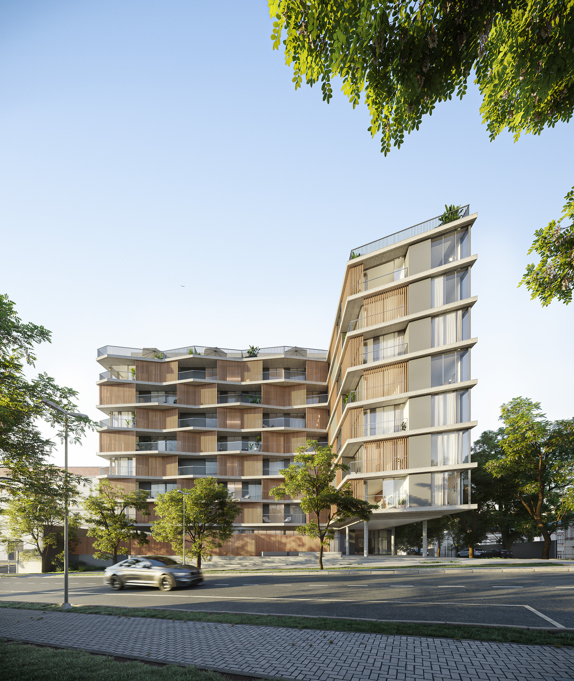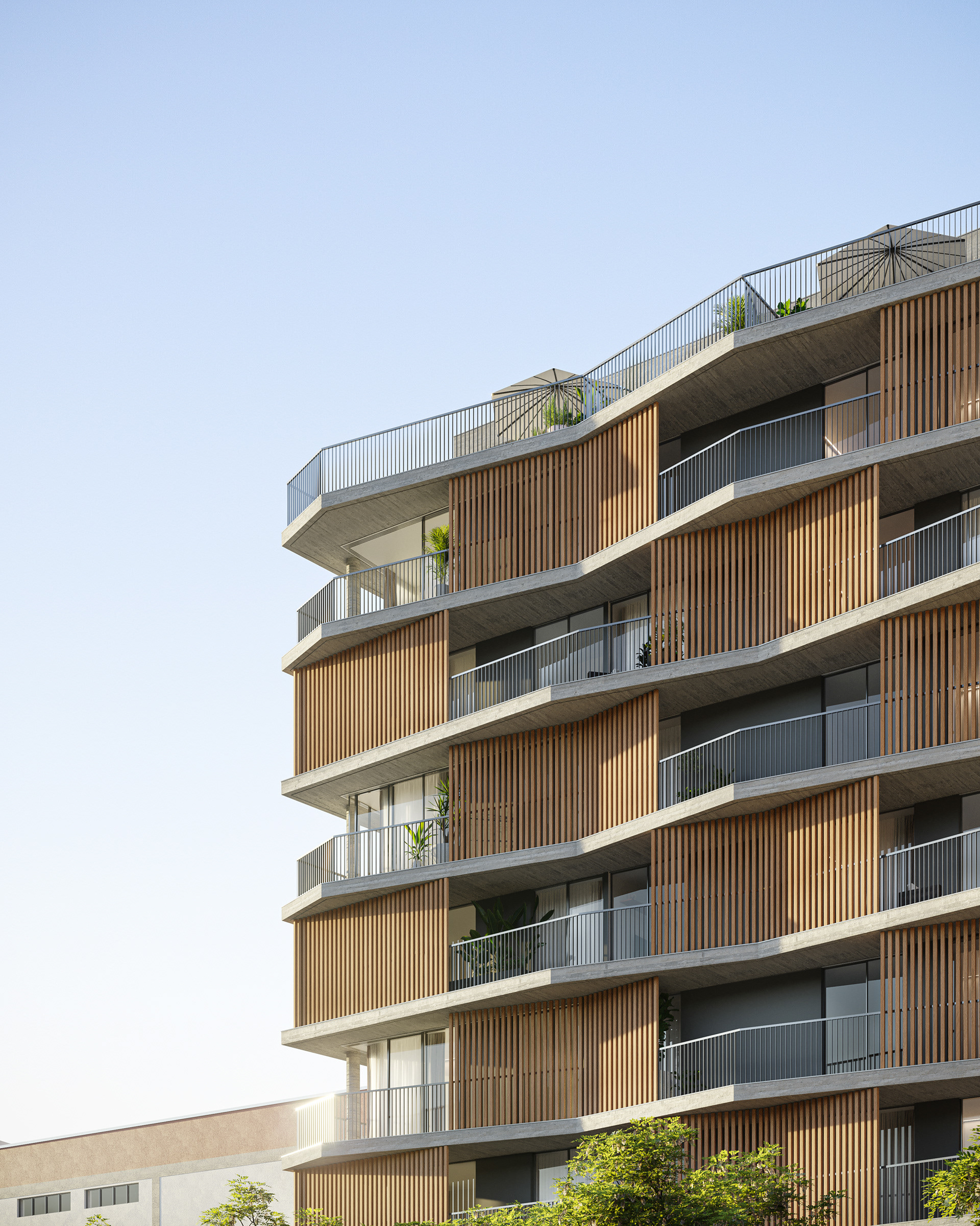 O conjunto resulta em uma linguagem edificada que responde diretamente à relação do apartamento com a cidade: a fachada plissada responde ao desejo de orientar as sacadas para as melhores vistas proporcionadas, e assim constitui a volumetria projetada.
