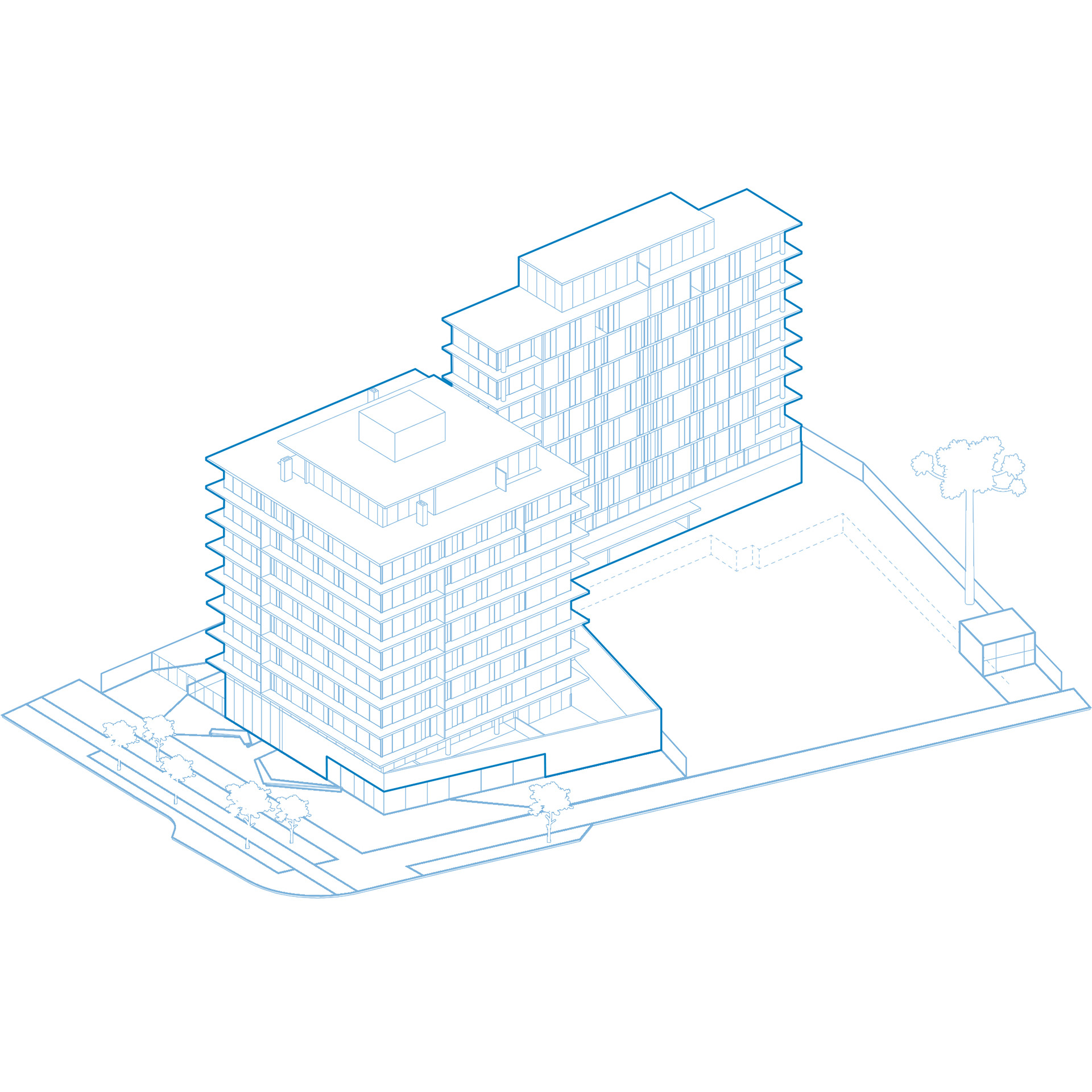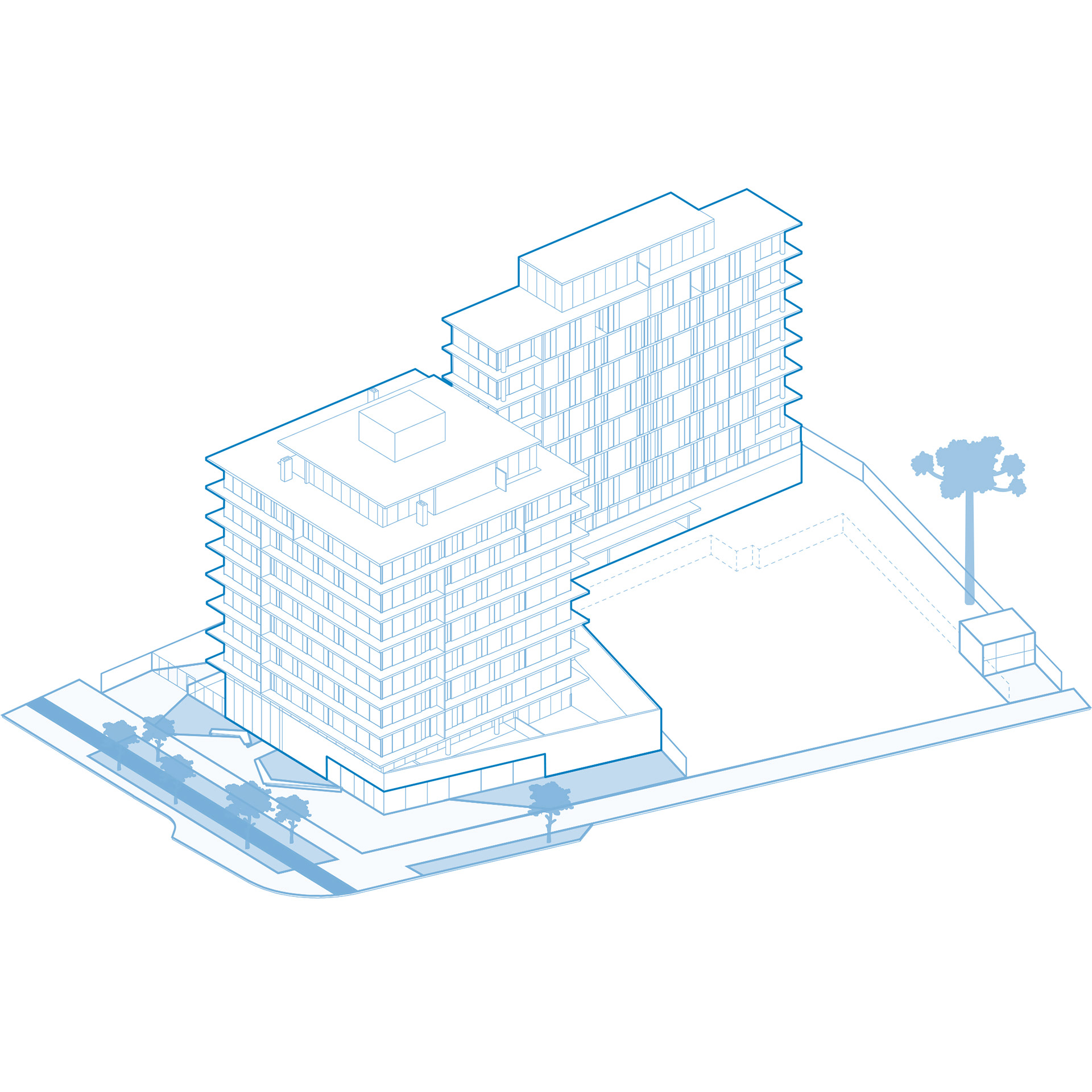 Nesse sentido, na esquina da Avenida Sete de Setembro com a Rua Cândido Xavier, propõe-se uma arquitetura de dois corpos que respiram: um mais próximo da esquina, articulado às dimensões urbanas das ruas que margeiam o lote; outro, mais afastado e privado, que se volta para a paisagem do miolo de quadra. Os núcleos de circulação são imersos nas massas construídas, de modo a livrar completamente o perímetro avarandado para as trocas humanas das relações com a cidade.