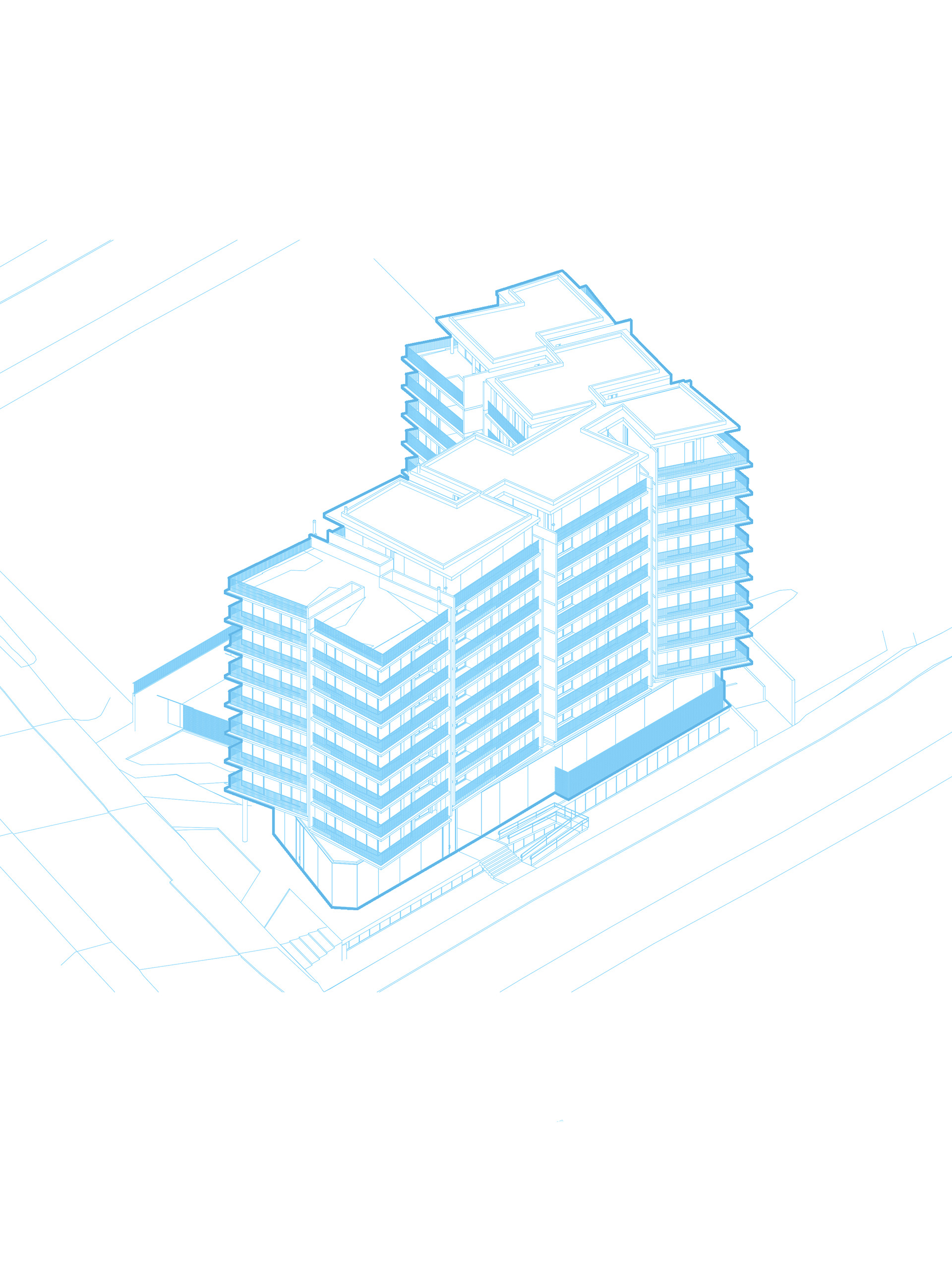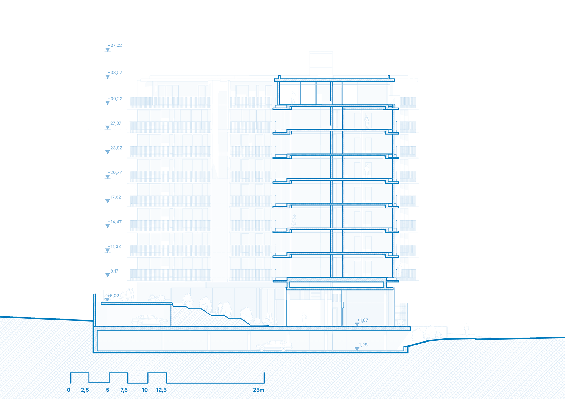 Desse modo, o edifício se desenvolve na forma de um “L” com uma volumetria entrecortada como um litoral, possibilitando ventilação cruzada em todas as unidades. Os materiais metálicos de revestimento remetem à antiga siderúrgica e fazem da memória um caráter imanente do edifício, seguindo o movimento atemporal de uma maré verde-jardim.