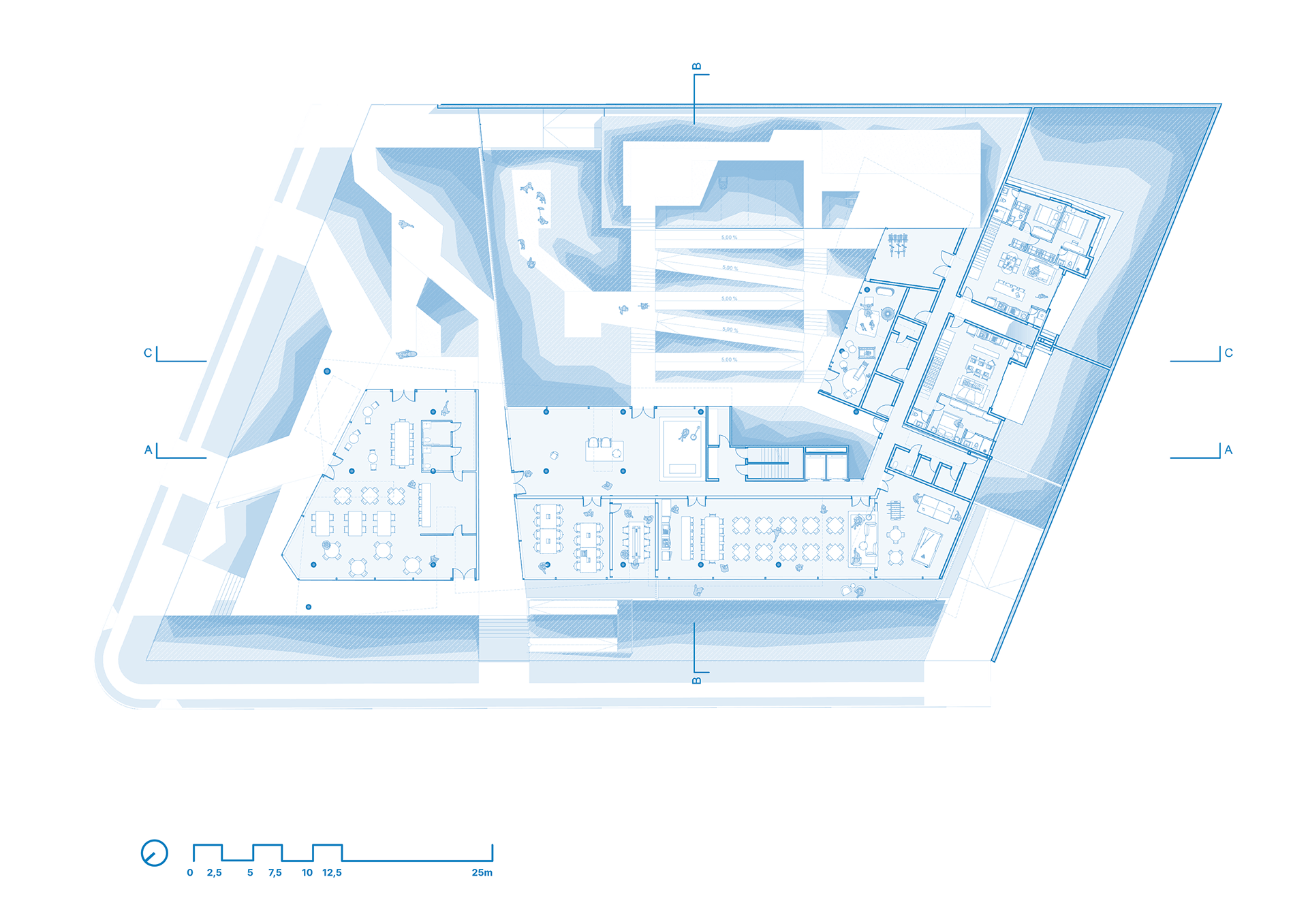 Para articular espaços livres nos domínios público e privado e entre futuras transformações da quadra, propomos que o edifício seja implantado junto à rua Amazonas, de modo a liberar uma praça-jardim no interior do lote, acessado a partir da rua Mato Grosso.