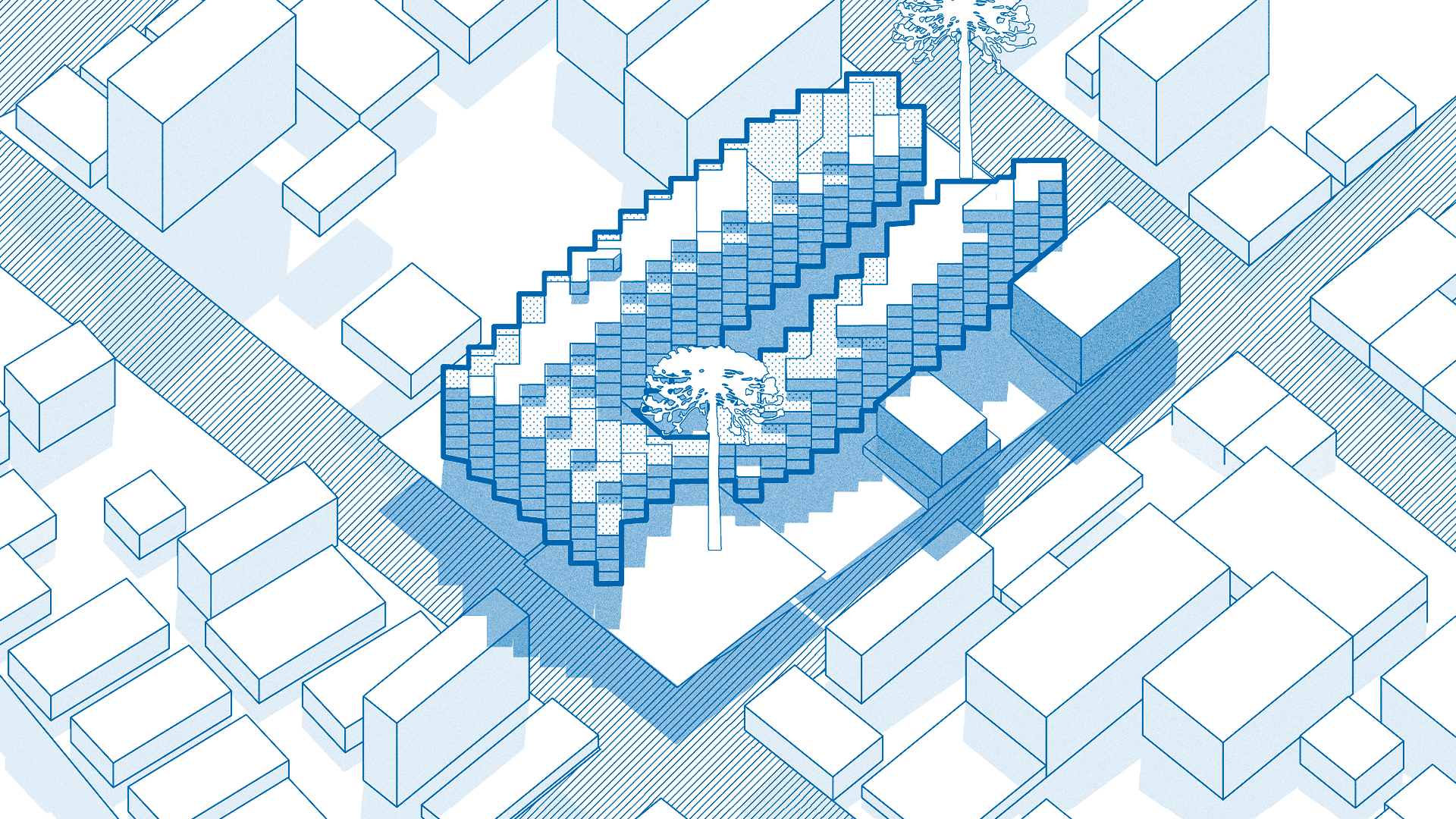 Esse é um estudo para um edifício destinado a abrigar pessoas da terceira idade, oferecendo moradias com facilidade de acesso a tratamento de saúde, refeições e lazer, integrados na solução do edifício. Duas araucárias e dois térreos marcam a implantação na topografia, que cria um pátio central de convivência, no qual as unidades olham para dentro. Elas estão rotacionadas, de forma a eliminar o vis-à-vis entre janelas, resguardando a privacidade da vida entre quatro paredes.