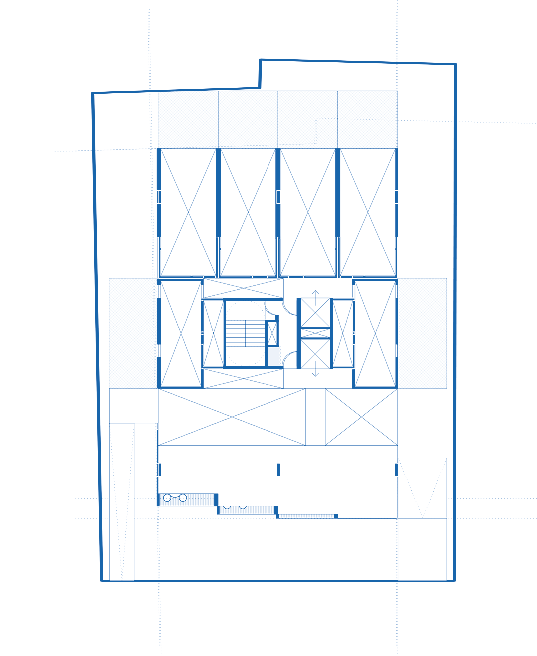 Partindo de uma implantação em caixa, o projeto centraliza a circulação vertical e divide as unidades em frontais e traseiras. Com um comércio térreo, a fachada para a rua se torna um mostruário de individualidades, havendo uma segmentação propositada em um grid que avança e recua em função das vistas.